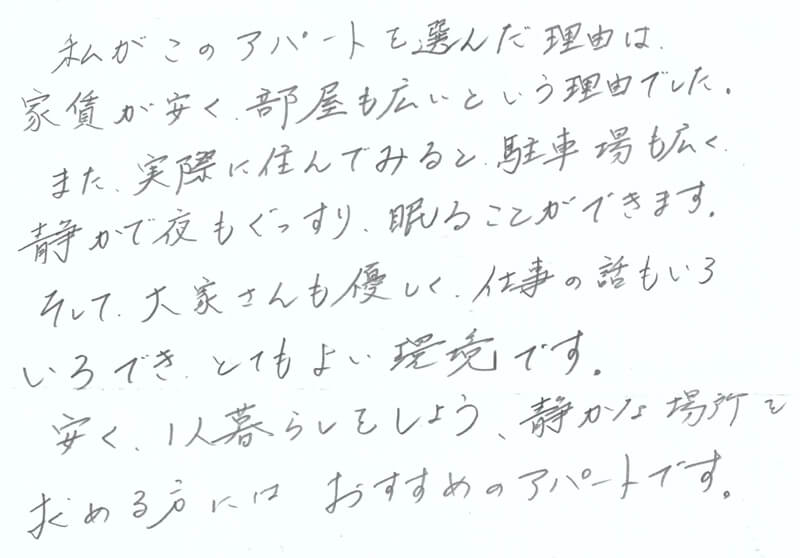 私がこのアパートを選んだ理由は、家賃が安く部屋も広いという理由でした。